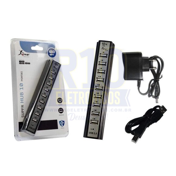 10 portas de alta velocidade USB 2.0 Entrada de alimentação: Adaptador 110V-240V, 50/60Hz Saida 5V DC 2A
