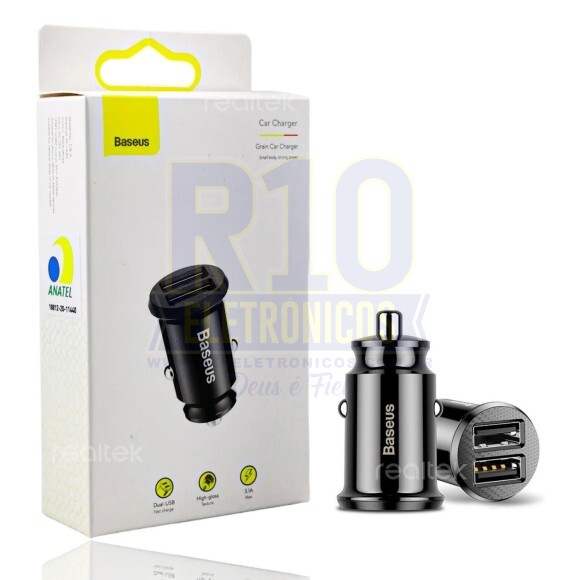 Carregador de veicular da marca Baseus, Grain, compatível tomadas de 12/24V. Este carregador conta com duas entradas USB e uma corrente total de 3.1A, consegue carregar dois aparelhos simultaneamente, nesse caso a corrente total sera dividida igualmente para os ambos os aparelhos. As portas USB podem ser usada para carregar o seu aparelho celular ou qualquer outro dispositivo compatível com carregamento USB, recomendamos a utilização de cabos de pelo menos 2A para um carregamento mais rápido e eficiente. Fabricado em plástico ABS PC, fazem dele um produto resistente e durável. Características do Produto: Marca: Baseus